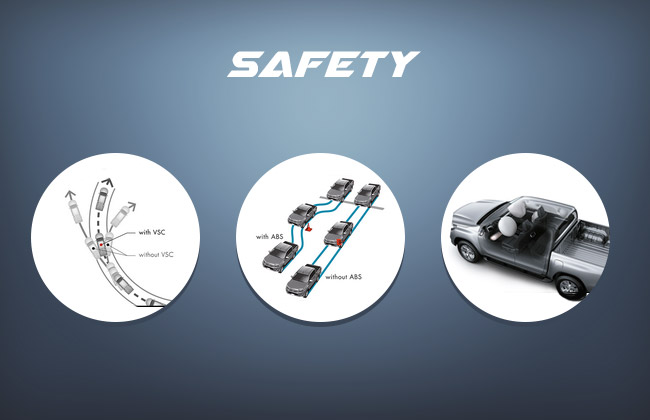 All-new Hilux despite being powerful is well-equipped with best-in-class safety features. First and foremost is its long array of airbags availability including front, curtain, shield, and driver's knee. Giving Hilux the much-needed stability when riding on the slippery terrains is its Active Traction Control system. In addition, is also present ABS brake system that ensures that there is no skidding and wheel locking.