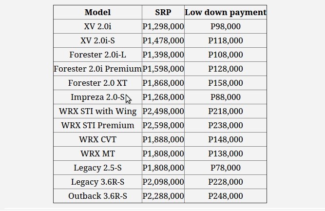 The list of Subaru models with down-payment promo prices -