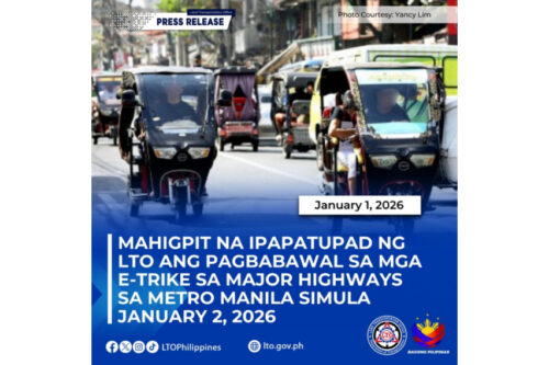 “Unawain po natin na ang hakbang na ito ay ginagawa natin para sa kaligtasan ng lahat ng gumagamit ng kalsada. Naiintindihan natin na marami sa atin ang umaasa sa mga e-trike bilang paraan ng paglalakbay, kaya naman handa ang LTO na makipagtulungan sa mga lokal na pamahalaan at mga sektor ng industriya para bumuo ng mga ligtas at angkop na ruta para sa mga e-trike sa mga darating na araw. Hinihikayat din po natin ang mga mamamayan na sumunod sa mga patakaran at makipagtulungan para mapanatili ang ligtas na daloy ng trapiko (Please understand that this step is being taken for the safety of all road users. We understand that many of us rely on e-trikes as a means of transportation, which is why the LTO is ready to work with local governments and industry sectors to develop safe and suitable routes for e-trikes in the coming days. We also encourage citizens to follow the rules and cooperate to maintain the safe flow of traffic),” he added.